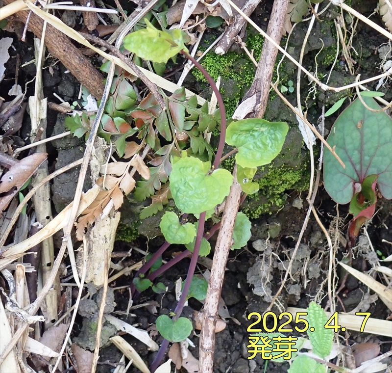 | 絶滅危惧種のツルギキョウの出現 2020年9月5日、新しく開かれた田んぼのあぜ道の脇で、いつも沢山池の植物を調査してくださっていた郡司さんにツルギキョウの花を初めて教えていただいた。調べてみると神奈川県で初めて1994年に平作3丁目で採集され、絶滅危惧ⅠA類に指定されている。環境省のレッドリストでも絶滅危惧Ⅱ類に指定されている希少な植物である。葉は心形でキキョウ科のつる性植物である。翌年の4月、田んぼのあぜや新しく造られた道の脇や切り開かれた樹林地の斜面から多数のツルギキョウの芽が現れた。その多さには驚かされた。何十年も眠っていた種子に陽が当たり発芽スイッチが入ったのであろう。植物は環境の攪乱(かくらん)・草刈り等によって様々な種が現れてくる。 |